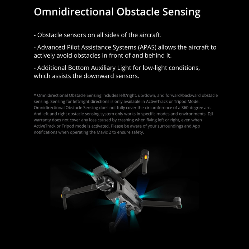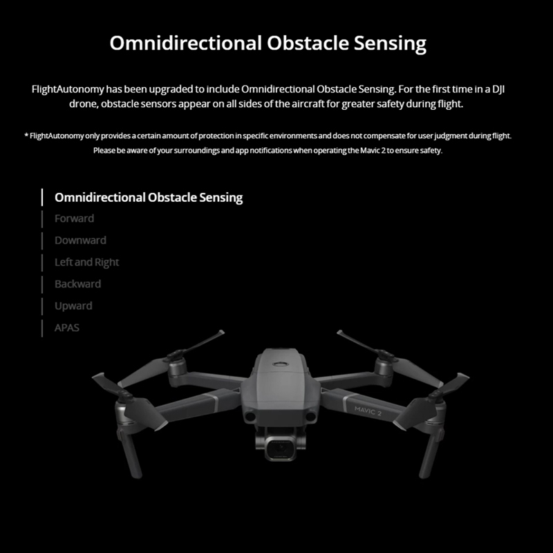 Detecção de Obstáculos Omnidirecionais: O FlightAutonomy foi atualizado para incluir o Sensor de Obstáculos Omnidirecional. Pela primeira vez em um drone DJI, sensores de obstáculos aparecem em todos os lados da aeronave para maior segurança durante o vôo.