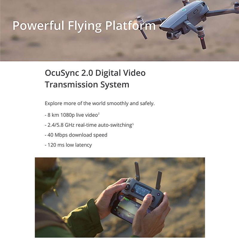 Sistema de Transmissão de Vídeo OcuSync 2.0: O desempenho de transmissão de vídeo OcuSync 2.0 é bastante aprimorado com melhorias na distância de comunicação, qualidade de vídeo e anti-interferência, oferecendo controle sem precedentes. (8 km de alimentação de vídeo 1080P; comutação automática em tempo real de 2,4 a 5,8 GHz; baixa velocidade de download rápida)
