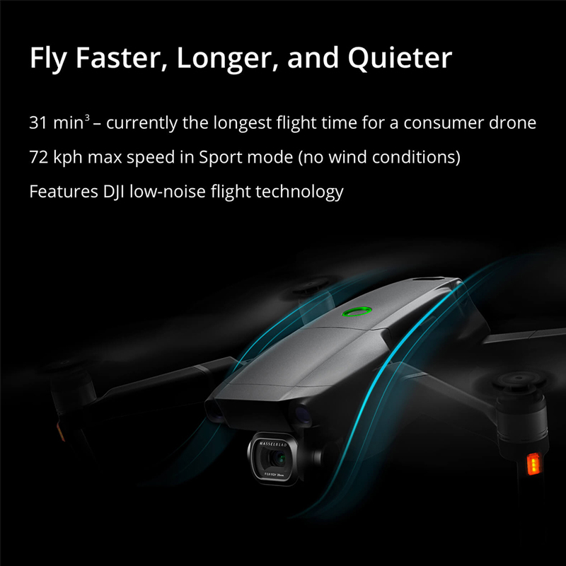 72 kph máx. Velocidade: O corpo da aeronave reconstruída apresenta melhor desempenho aerodinâmico. O arrasto do corpo do Mavic 2 é 19% menor do que o do Mavic Pro ao voar em plena