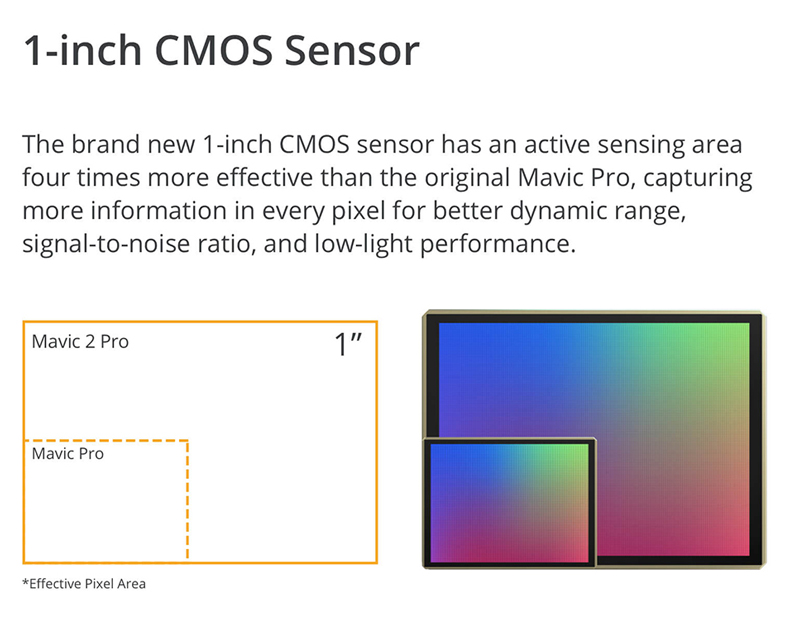 O novo sensor CMOS de 1 polegada possui uma área de detecção ativa quatro vezes mais eficaz que o Mavic Pro original. O sensor grande também significa melhor desempenho em ambientes de pouca luz com uma faixa ISO mais extensa, máx ISO elevado de 3200 para 12800. O Mavic 2 Pro suporta um perfil de cor Dlog-M de 10 bits que produz maior faixa dinâmica para maior flexibilidade a sala de classificação. O sistema registra mais de 1 bilhão de cores (em comparação com as 16 milhões de cores das tecnologias tradicionais de codificação de cores de 8 bits) e retém detalhes mais detalhados em realces e sombras. Agora você pode capturar as gradações mais sutis ao pôr do sol ou nascer do sol, deixando um espaço maior para a pós-produção. Com suporte HDR 4K de 10 bits, o Mavic 2 Pro pode ser conectado a uma TV 4K com HLG e reproduzir imediatamente a gravação com os tons de cores corretos. Os destaques mais brilhantes e o contraste aumentado são o que torna o vídeo HDR tão atraente.